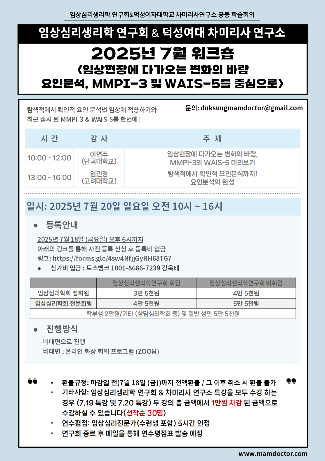 #덕성여대 #심리학과 #맘닥터 #임상심리학 #임상심리생리학연구회 #차미리사연구소 #임상심리전문가 #뇌파 #MMPI-3 #요인분석 #특강